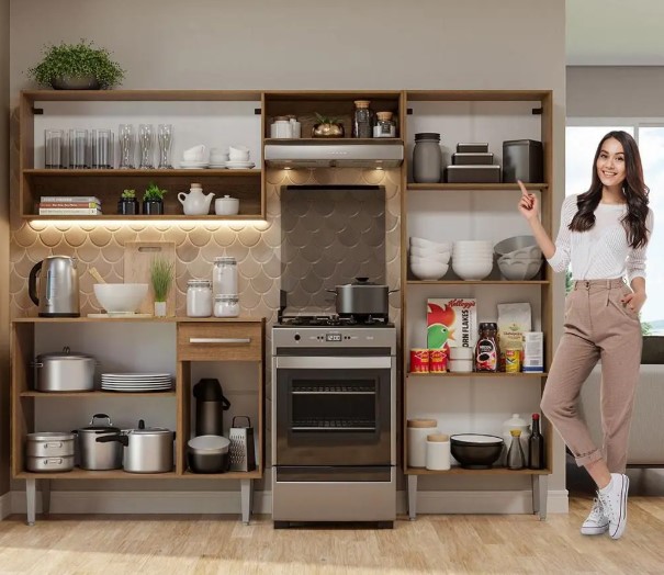A Cozinha Compacta Emilly se destaca por ser compacta e prática para o dia-a-dia. Seu espaço interno é bem distribuído e as tonalidades amadeirado e preto combinam com ambientes modernos ou clássicos.